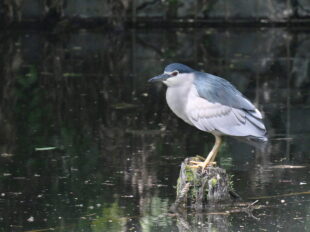 野鳥に親しむ会の翌日、新池でゴイサギ成鳥が水浴びの後、杭の上で羽繕いをしていました。 (画像提供 稲垣先生)