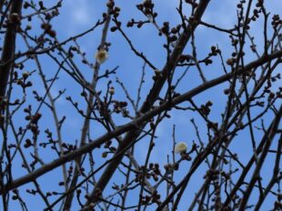 令和8年1月11日 梅林の白梅が5輪ほど咲いていました。紅梅はつぼみのみ。花芽がたくさんついているので、これから楽しみです。