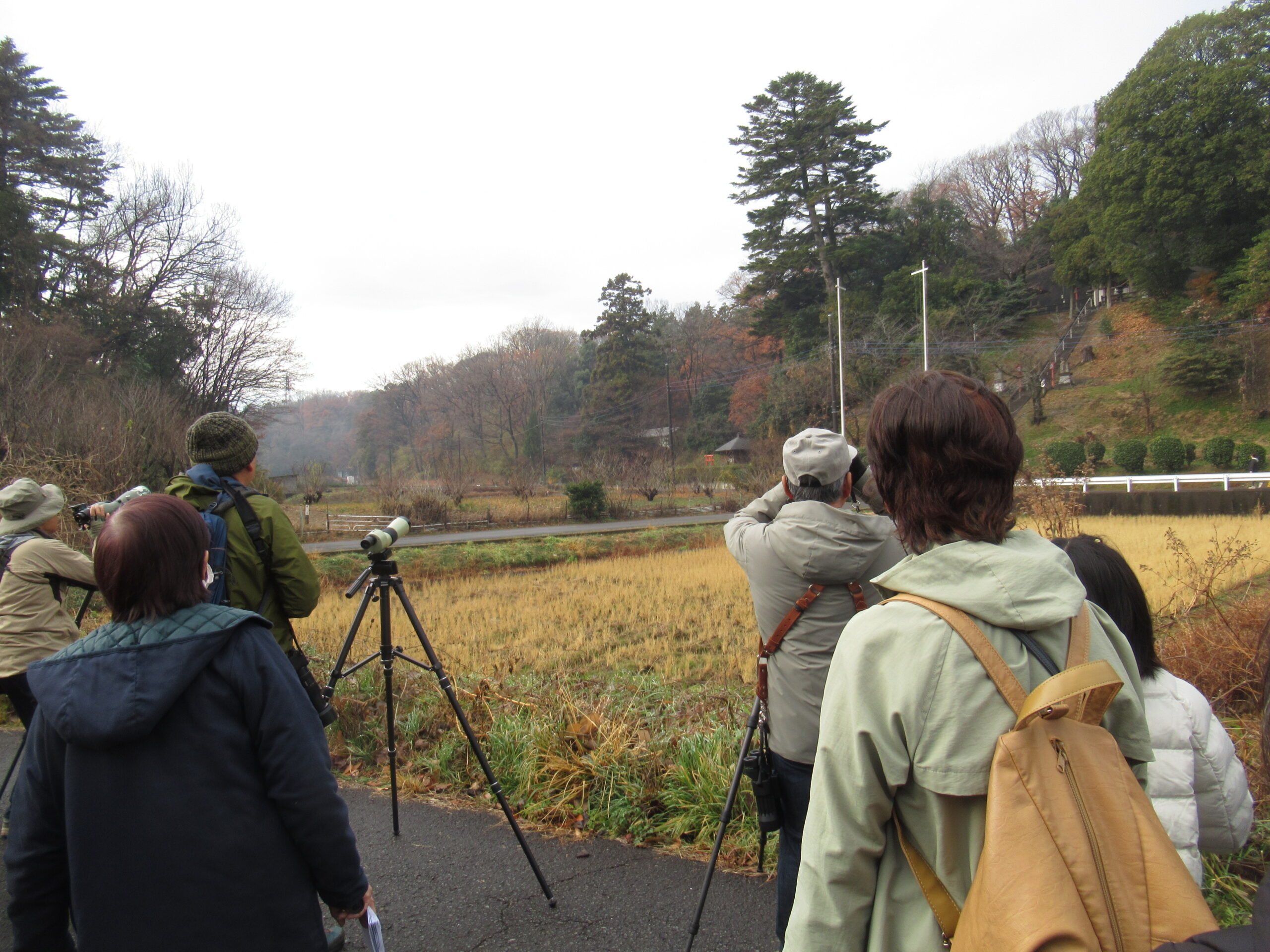 何度もハイタカが飛び回ったせいで小鳥の数は低調でしたが、前半は梢に集まったシメ・ツグミ・カシラダカなどの群れを参加者全員がスコープで観察することが出来ました。